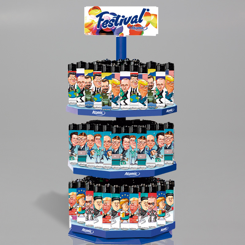 Este expositor carrusel incluye 144 encendedores con diseño colorido y con diveridas caricaturas de los auténticos jefazos del mundo.