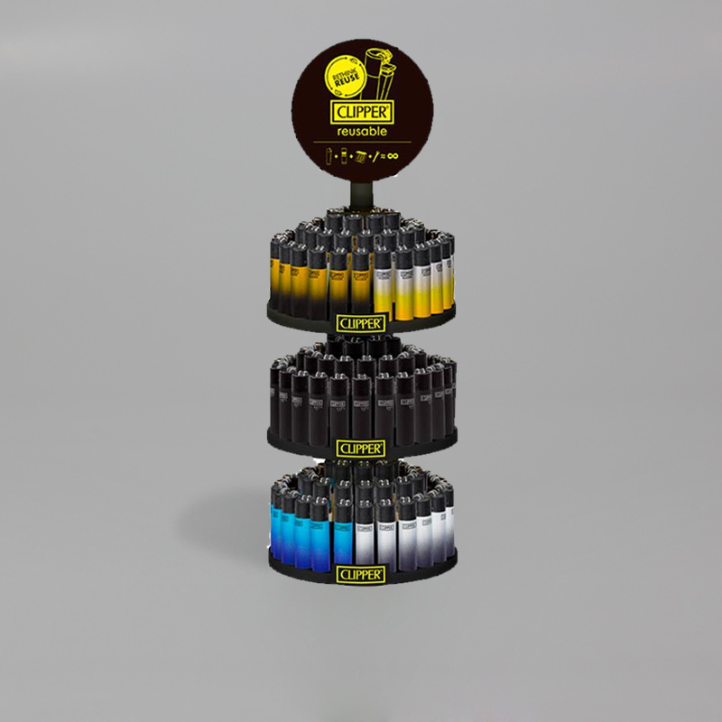 Expositor de 144 encendedores de diferentes acabados y color de cabezal negro. Consiguiendo con este lote un precio muy competitivo.