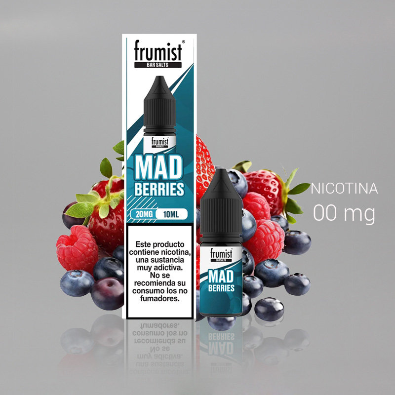 Sumérgete en una explosión de sabor con Frumist Salts Mad Berries 20mg 10ml. Este e-líquido ofrece una mezcla salvaje y jugosa de bayas rojas variadas, destacando el equilibrio perfecto entre la vibrante dulzura de fresas maduras, la acidez refrescante de frambuesas y el sabor profundo de otras frutas del bosque, para una experiencia intensa y equilibrada en cada calada.