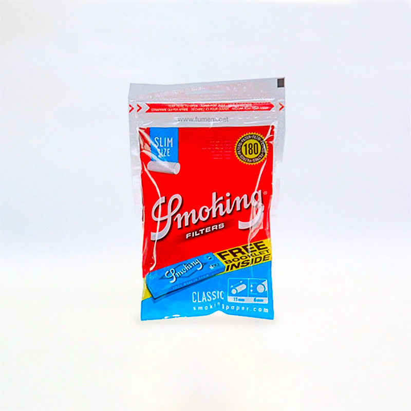 Pack de una bolsita de 180 filtros Slim Classic y un librito Smoking Blue Regular. Cada caja contiene 30 unidades.
