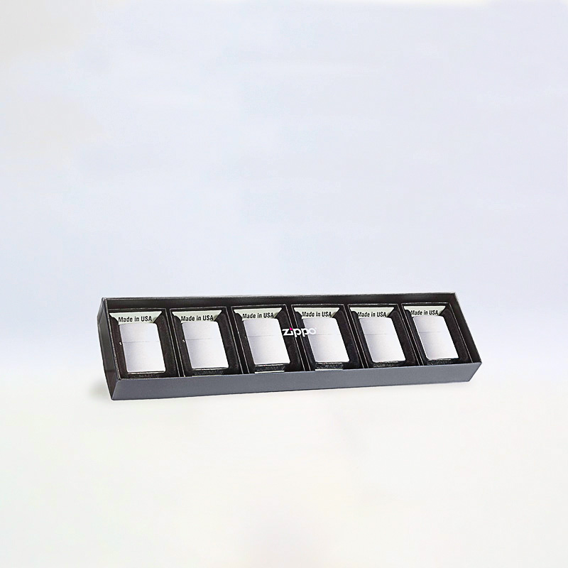 Expositor con forma de caja para encendedores Zippo con capacidad para 6 unidades. El expositor se sirve vacío.